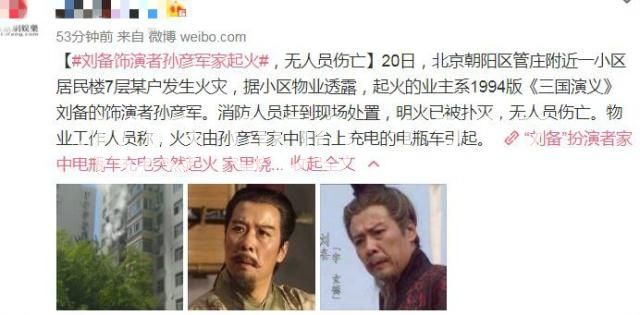 近日北京朝陽(yáng)某小區一住戶(hù)家中發(fā)生火災,整個(gè)房屋內物品全部燒毀,據該小區物業(yè)工作人員透漏,起火的業(yè)主是94年《三國演義》劉備的飾演者孫彥軍。幸好此次事故無(wú)人員傷亡,據小區物業(yè)工作人員介紹,業(yè)主孫彥軍是在家里的陽(yáng)臺上給電瓶車(chē)充電的,在充電的過(guò)程中導致起火。